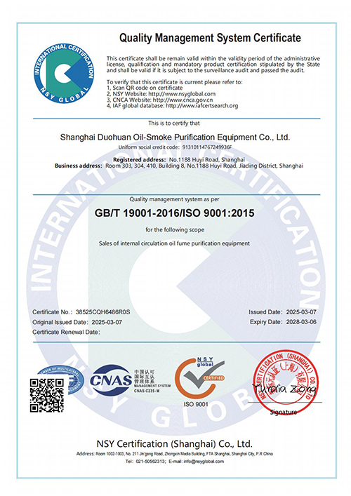 ISO9001認(rèn)證 是全球公認(rèn)的質(zhì)量管理標(biāo)準(zhǔn),它代表著國(guó)際社會(huì)對(duì)上海多環(huán)油煙凈化設(shè)備有限公司產(chǎn)品質(zhì)量的認(rèn)可,也標(biāo)志著多環(huán)公司在規(guī)范化、標(biāo)準(zhǔn)化、國(guó)際化的道路上邁出了堅(jiān)實(shí)的一步。